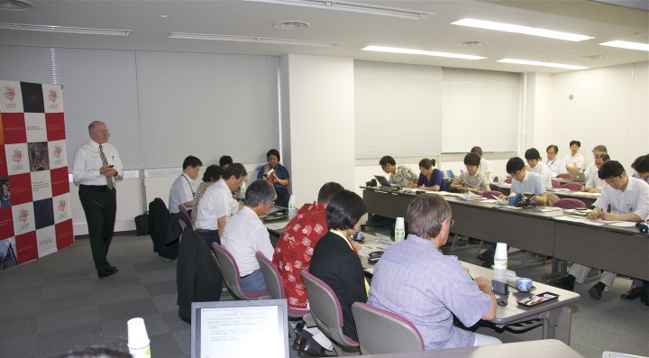 ジョナサン・ドーファン学長、記者懇談会にて。2012年7月3日(東京)