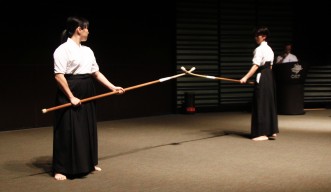 最初の演武では、合気道の武道家6名が、相手をかわすことで身を護り、攻撃を無力化する技を示しました。合気道とは、その名称が示唆する通り、戦う術を教えるものではなく、「和」の精神を追求する武道です。合気道では相手の力を利用して身を護る技を身に着けるため、強い力は必要ありません。実際、演武を行った武道家のなかに70代の方もいらっしゃいました。