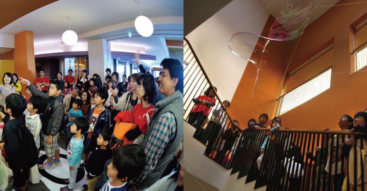 3月3日(日)に開催されたOISTオープンキャンパス2013は、4000名を超える来場者をお迎えし、OISTの200名のボランティアをはじめ、食事を提供頂いたKaito+カフェを含む12の店舗のご協力により、大盛況のうちに幕を閉じました。午前10時の開場の1時間後には、既に駐車場がいっぱいとなり、展示会場や研究室は家族連れの来場者でにぎわいました。階段の吹き抜けに巨大シャボン玉が設置された第2研究棟から、ゼブラフィッシュのタンクが何列も連なった研究室まで、どの会場も見学に訪れた方々の笑顔であふれていました。