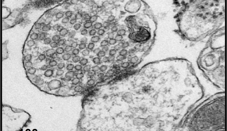 神経細胞間の接合部分に目を向けると、神経細胞から神経細胞へ神経伝達物質をやりとりするためのシナプスと呼ばれる部位が存在しています(図1)。伝達物質を放出する側をシナプス前末端、受け取る側をシナプス後膜といい、シナプス前末端には伝達物質を詰め込んだシナプス小胞と呼ばれる直径50ナノメートルほどの袋が格納されています。電気信号がシナプス前末端に到達すると、シナプス小胞が前末端膜に融合し、中の伝達物質を外へと放出します(エキソサイトーシス)。シナプス後膜は伝達物質を受容体で受け取り、電気信号へと変換し情報が受け渡されます。シナプス前末端膜に融合した小胞膜はその後末端内に取り込まれ(エンドサイトーシス)、再びシナプス小胞としてリサイクルされます。