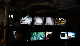 海溝に潜る度、ネーレウスは高解像度カメラを使い、リアルタイムの映像を母船に送信します。研究者達はその映像を観るため、 幾つも並ぶ画面の前に集まります。中には、顕微鏡下での堆積物観察に匹敵するほど詳細な映像もあります。専門スタッフがネーレウスの位置を操作し、いつどこでサンプルを採取するか指示を出します。研究者が興奮して画面を指差せば、専門スタッフはネーレウスをその場で止めて、海底堆積物や深海生物を採取することもあります。
