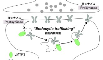 LMTK3という細胞内タンパク質は、脳内において知覚、運動、思考などを統合する大脳皮質や記憶・学習を司る海馬に多く存在します。脳は多数の神経細胞がシナプスと呼ばれる接合部位を介して情報伝達を行っています。シナプスでは、情報を送る前シナプスから神経伝達物質が放出され、後シナプスに存在する受容体がそれを受け取り、神経細胞間の情報を伝えます。同研究チームは、LMTK3が後シナプス内において、神経伝達物質の受容体の輸送を制御するタンパク質であることを突き止めました。LMTK3を欠損したマウスの神経細胞では、この受容体が細胞内に蓄積しており、シナプスにおける情報伝達を正常に行うことができないと考えられます。そして、LMTK3を欠損したマウスの様々な行動異常を調べたところ、落ち着きのない行動や音に対する過敏反応などの多動性障害の性質を示すことが分かりました。またLMTK3が欠損したマウスでは、同時にドーパミンが高い数値を示すことも確認されました。ドーパミンは運動調節、ホルモン調節、感情表現や意欲、学習などに関わる神経伝達物質の一つで、その過剰な分泌は、神経活動の統合性が失われ、思考や感情のバランスが乱れる統合失調を引き起こすことで知られています。LMTK3の作用とドーパミン代謝の関係や、LMTK3による受容体輸送の制御と多動性発症に至る詳細なメカニズムは解明されておらず、研究チームは引き続き、LMTK3の働きと多動性との相互関係を明らかにしていこうとしています。