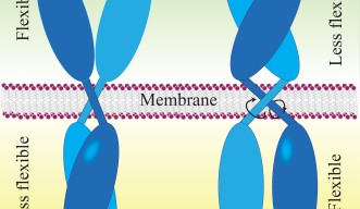 受容体の細胞外部分にリガンドが結合すると、細胞膜内の膜貫通領域の回転を誘発し、細胞内の活性化を起こします。さらに、その過程においてタンパク質の柔軟性(フレッキシビリティー)も変化します。リガンド結合前は、受容体の細胞外部分の柔軟性が高く、細胞内部分は安定していますが、結合後はその逆で、外部分が安定化し、内部分の柔軟性が高まります。このようなタンパク質の柔軟性は生体内で作られる熱エネルギー、つまり体温により起こります。