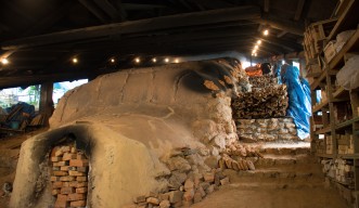 北窯は読谷村やちむんの里にあり、OISTから南に車で20分ほどの距離です。この県内最大の13連窯の登窯では、年に5回火入れが行われます。巨大な登窯に何千もの器が詰められた後、3日3晩窯焚きが行われ、その間北窯の親方たちと弟子たちは交代で寝ずに火の番をします。このとき窯内の最高温度は1400℃近くまで上がります。