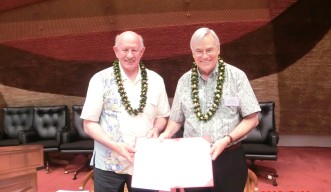 7月10日(日本時間11日)にハワイ州議会議事堂で調印式が行われ、OISTのジョナサン・ドーファン学長とハワイ大学のロバート・ブレイ・ブロマン学長代理が協定書を取り交わしました。
