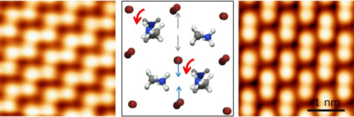研究者らは、メチルアンモニウム分子が回転すること、およびそれらの分子の回転によって明らかに異なる特性を持つ2種類の表面構造を生み出すことを発見しました。また、回転とは別に、このメチルアンモニウム分子は隣接する臭素イオンの位置に影響を及ぼし、その結果、原子構造にさらなる変化をもたらします。この構造によって材料の電子的性質が決定されることから、原子の幾何学的位置は太陽電池を理解するために不可欠な要素です。