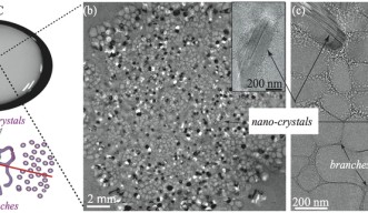 溶液中の様子を観察するため、ウルフ・スコグランド教授率いるOIST構造細胞生物学ユニットは、低温電子顕微(クライオ電顕)と呼ばれる新しいタイプの電子顕微鏡を用いて、-200℃近い温度でサンプルを凍結・分析しました。クライオ電顕で撮影した画像は、濁度の上昇は球状ミセルから、より原子が並んだ構造へと移行するためであることを示しています。ミセルは球状からミミズ状に組織化し、更に分岐ミセルになり、最終的に結晶様構造に変化します。