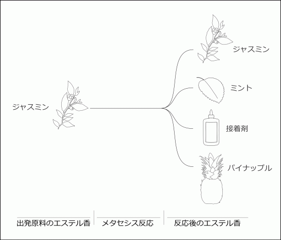 デュベイ博士とハサキン博士はまず、分子の骨格を組み替えるメタセシス反応という有機化学でよく用いられる反応の1つをエステルにも適用可能かどうかを検討しました。まず化学反応によりエステルの中心部とその周辺部位の結合を切断し、さらにそれらの2つの断片が再結合される過程で、4つの異なるエステルが生成します。「このような分子の再構成をおこなえば、私たちは4つの生成物を得ることができるはずです」とハサキン博士は言います。「1つのエステルから4つの生成物が生まれるのです。原料と同じエステルが1つと、化学的に可能な3つの新しいエステルです」。