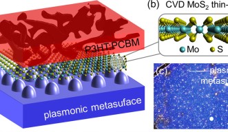 しかしながら、これらの材質の薄さは、太陽光発電の材料として、もしくは光―エネルギー変換装置の効率性においては、制約要因となります。太陽電池や光検出器などの光を吸収する装置は、光子を通過させてしまうのではなく、吸収するため、ある一定量の光学的厚さを要するからです。この問題を克服するため、フェムト秒分光法ユニットでは、装置内に光を集中、局在させるため、有機半導体とMoS2のハイブリッド素材に、銀のナノ粒子配列、すなわち、プラズモニック・メタ表面を加えました。メタ表面を加えたことで、超薄型のアクティブ層の固有特性である、光の総吸収量を増加させる性質を生かしつつ、材料の光学的厚さを増やすことができます。