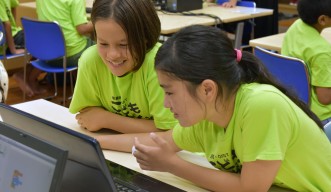 5・6年生クラスに参加の鈴木恵美花さんは、コンピュータゲーム「Pong」を作る方法を学びながら、「(大きくなったら)プログラミングでゲームを作りたい。」、同じクラスの神山萌夏さんも