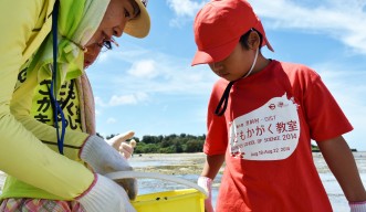 3日目の水曜日、小学1・2年生の「うみのいきものをさがしてみよう」クラスでは、海洋動物の探索と採取のために海岸を訪れました。生き物を集めた後は、それらを教室の近くの水槽に入れて、行動を観察しました。
