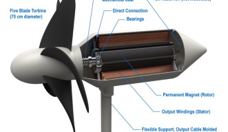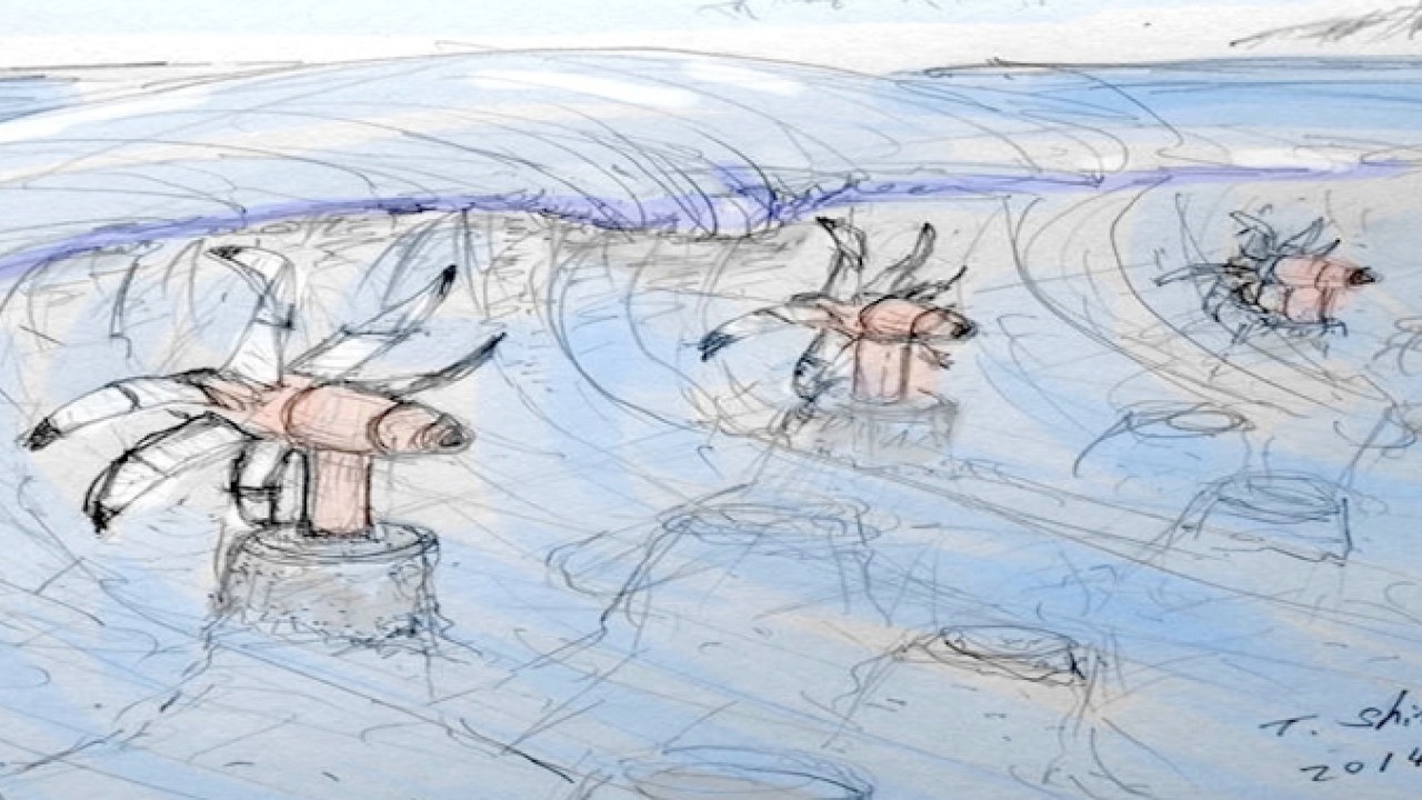 発電タービン自体は、激しい波の威力のみならず台風のような極端な気象に耐え得るように設計されています。羽根のデザインと素材は、イルカのヒレからヒントを得ました。柔軟性があり、波の力を逃がすことができ、破損してしまうということはありません。 支柱の構造も「花のような」柔軟性があると、新竹教授は説明します。 花の茎が風に沿って後方に曲がるように、タービンも、アンカー軸に沿って曲がることができ、周囲の海洋生物にとって安全なように作られています。羽根は注意深く計算されたスピードで回転し、羽根の間に生物が巻き込まれても、逃げることができるように設計されています。