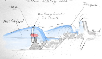 そこで登場したのが、海岸に打ち寄せる波の力です。 「海岸を巡ると特に日本では、数多くのテトラポッドがありますよね。」と新竹教授は語ります。 テトラポッドなどの消波ブロックとは、打ち寄せる波の力を弱め、海岸を侵食から守るため、しばしば海岸線に沿って設置されているピラミッド状のコンクリート構造物です。 また同様に、消波ブロックと同じ目的で海岸の手前に建てられたのが防波壁です。 「驚くべきことに、日本本土の海岸線の30%は、テトラポッドと防波壁で覆われています。」 新竹教授によれば、これらを特殊な消波ブロックと防波壁に置き換えれば、海岸を保護すると同時に、消波ブロックに設置した発電タービンで、エネルギーを産出することもできるのです。