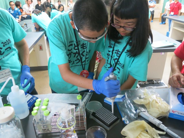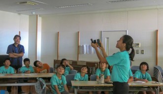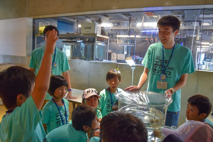 こどもかがく教室は恩納村のふれあい体験学習センターで行われ、幼稚園から6年生までの児童が、屋内での実験から、近くの国際海洋研究情報センター(GODAC)へのフィールドワークに至るまで幅広い体験学習をしました。好奇心旺盛な子どもたちの心をつかみ、科学の研究が持つ可能性を知ってもらうため、本物の科学と楽しさを織り交ぜることを目的としています。