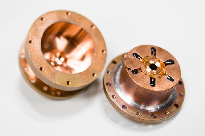 密閉容器は、セルと呼ばれる小さな円筒状の容器で、各容器には液体ヘリウムが入っており、絶対零度に近い温度に保たれています。ヘリウムはこのような極低温下でも液体の状態を保ちますが、浮遊する不純物は凍結してセルの側面にはり付きます。電子はヘリウムの表面に結合し、二次元シートを形成します。研究者らはセルの鏡間の光を捕獲することで、そこにある電子をマイクロ波のような電磁放射線にさらすことができるのです。