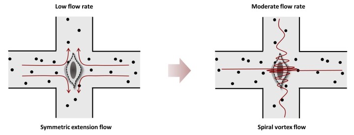 2つの対向する,低流速(左)で流れる水が十字交差部で合流すると、流れは対称的に分かれて流れ続け、その結果,細胞は中心で引き延ばされる。中流速(右)に上げると、小さな流動不安定性の増大によりらせん渦が形成され、十字交差部の中央で細胞を変形させる。