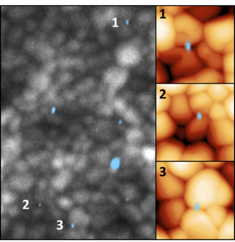 興味深いことに、トラップの場所をペロブスカイト材料の結晶粒を示す画像に重ね合わせたところ、トラップクラスターは特定の場所でのみ形成されることを発見しました。