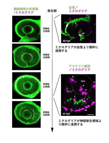 政井教授は次のように説明しています。「発生期の脳は非常に中身が詰まった組織です。ミクログリアがどのようにしてその中に入り込み、内部を移動するのかを想像するのは困難ですが、私たちはそれが眼球内の血管を経路として利用していることを発見したのです。」