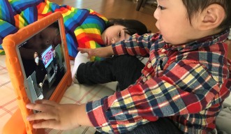 2021年1月30日(土)にオンラインで開催されたOISTサイエンスフェスタを見る子どもたち。総合司会を務めるマイケル・クーパーさんとヤナ・マネヴァさんの姿。
