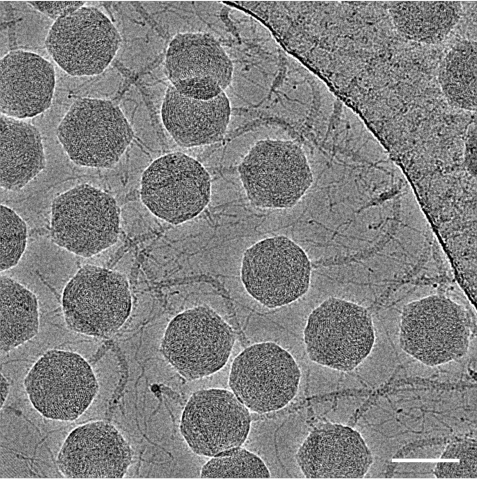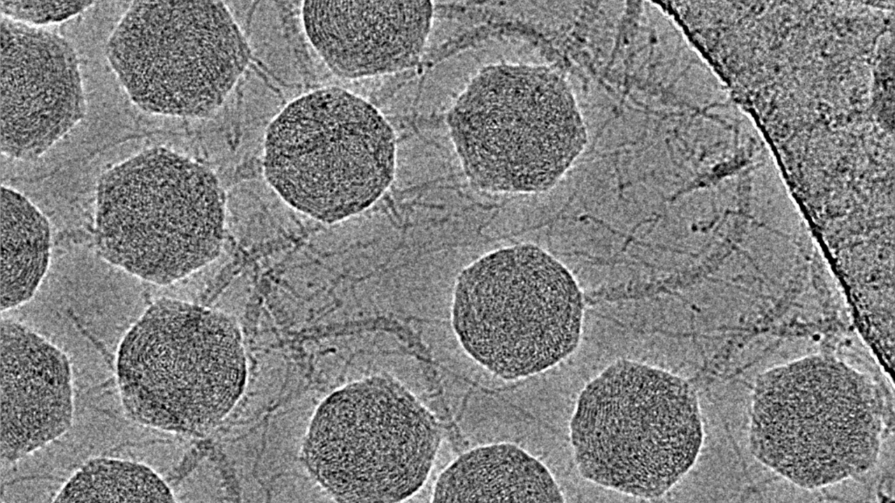 「これらのバクテリオファージを特定の目的のために効率的に改変するには、その構造様式を原子レベルで知り、標的細菌に感染するメカニズムを解明する必要があります。このような理由から、クライオ電子顕微鏡を使って、バクテリオファージ DT57C全体を高解像度で可視化することにしました」と生体分子電子顕微鏡解析ユニットを率いるマティアス・ウォルフ教授は説明します。
