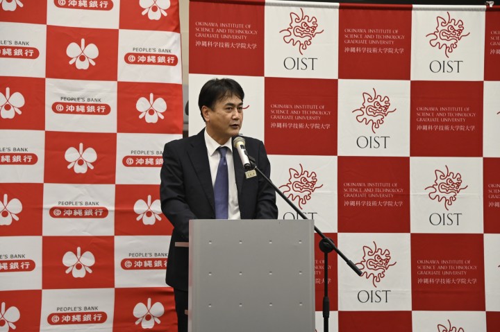 助成金授与式には、沖縄銀行 法人事業部 執行役員部長の又吉 司氏やOIST准副学長(技術開発イノベーション担当)のローレン・ハをはじめとする関係者が参加しました。