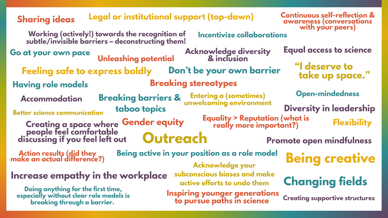 今回のイベントには、学生から教員まで、女性だけでなく多くの男性や、科学者以外のスタッフも参加するなど、多様なバックグラウンドをもつ参加者が集まりました。「それぞれが違っていても、話し合って共通の目標に向かって努力することで、一人ひとりの結びつきが強くなります」見えない壁に立ち向かうには、全員が意欲をもって参加し、話し合い、共感しあうことが重要だとファンさんは話します。