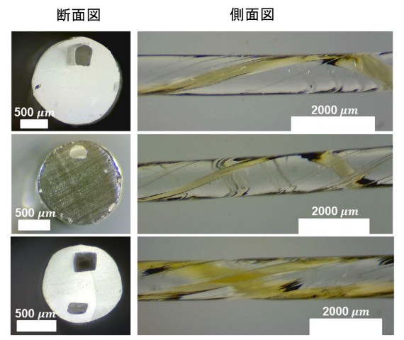 微小流路を集積したファイバーを開発するために、まず、チャンネルを持つポリマー製プリフォームという成形物を製作しました。その成形物を加熱しながら引き延ばすことにより、構造を維持したまま直径数百ミクロンのファイバーをつくることに成功し、チャンネルも約20分の1の大きさにまで縮小され、ファイバー内部にマイクロ流路を形成しました。さらに、延伸中にファイバーを水平方向に回転させることで流路も回転し、三次元のらせん型流路を形成しました。本研究では、この回転型熱延伸法を活用することで、様々な断面形状とらせんピッチを持つ三次元微小流路の開発に成功しました(図3)。