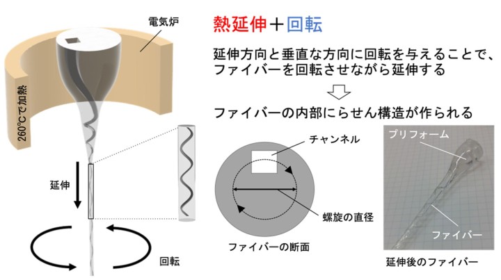 東北大学学際科学フロンティア研究所の郭媛元准教授と工学部学部生の加藤駿典氏(学際研ジュニアリサーチャー)、沖縄科学技術大学院大学(OIST)のエイミー・シェン教授とダニエル・カールソン博士(当時研究員)で構成された学際的な研究チームは、これらの課題を解決するために、光通信ファイバーの製造技術である熱延伸法を改良し、卓上型回転熱延伸法(mini-rTDP)を開発しました。そしてこの新たな手法を利用して、三次元らせん型微小流路を持つポリマーファイバーを開発することに成功しました。