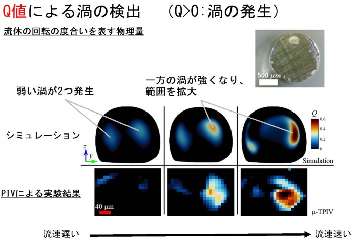 また数値流体力学解析に基づいた流体シミュレーションを行いました。さらに、ファイバーからマイクロ流体デバイスを作成し、マイクロPIV(注4)による三次元流速分布計測実験も行い、らせん流路内のマイクロ流路について詳しく評価しました。曲率を持った流路内にはディーン渦が発生することが知られており、本研究ではシミュレーションと実験結果の両方でディーン渦の発生を確認することができました(図4)。