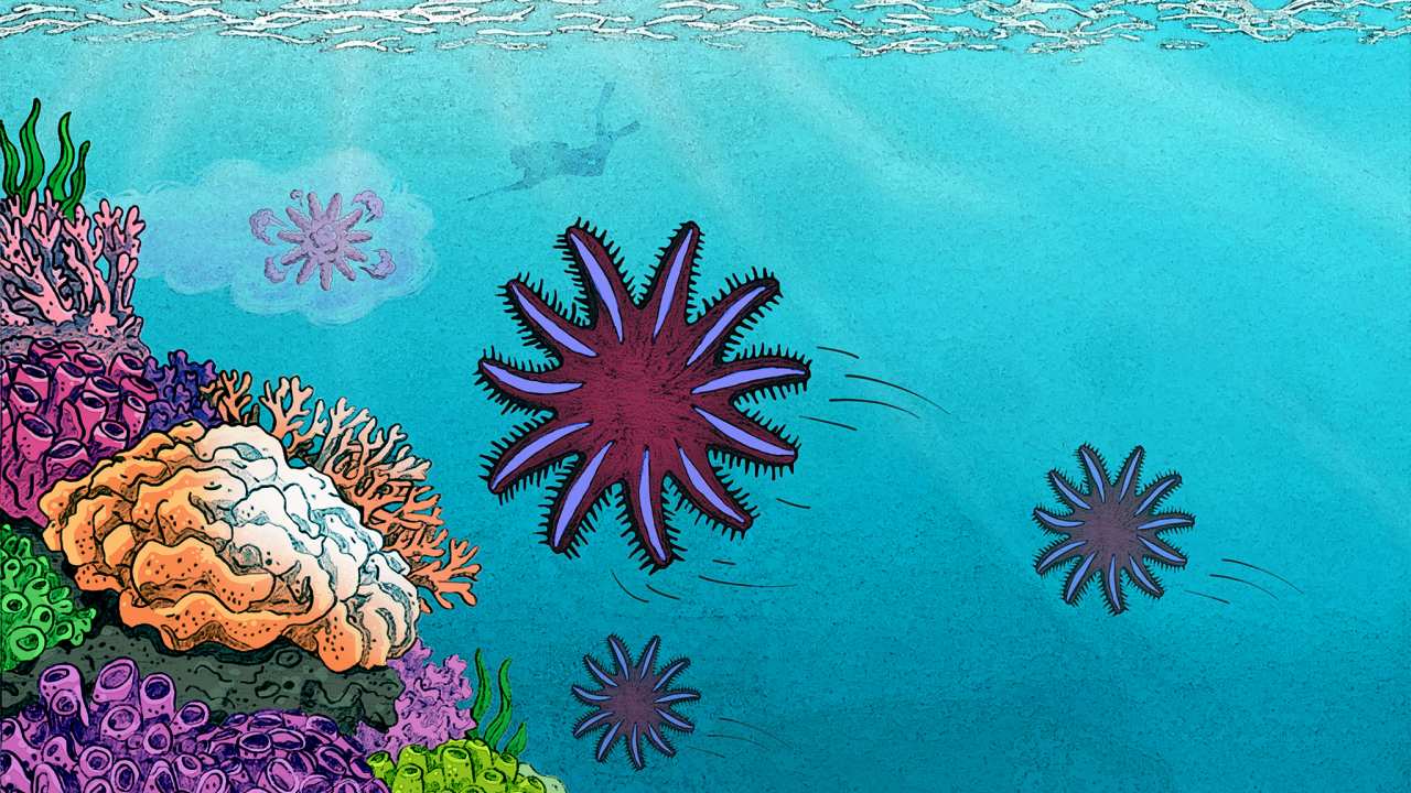 オニヒトデ( Acanthaster;CoTS: crown-of-thorns starfish)は、インド・太平洋地域のサンゴ礁に生息する在来種であり、生態系の健全性を維持するうえで重要な役割を果たしています。1匹のオニヒトデは、1日に最大240平方センチメートル、年間でおよそ10平方メートルのサンゴ組織を摂取することがあります。しかし、大発生が起きると、数千匹ものオニヒトデが群れを成し、わずか数か月で数ヘクタールものサンゴを食い荒らしてしまいます。こうした過剰な捕食は、硬い骨格を持つサンゴを枯渇させることで、サンゴ礁の健康や安定性を損なうだけでなく、サンゴ礁の長期的な回復力を弱め、気候変動という最大の脅威に適応する力を妨げます。