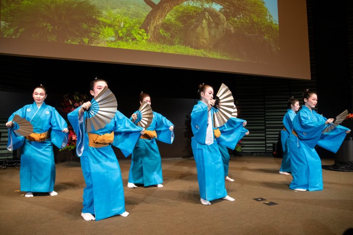 この日は、沖縄の伝統とOISTならではの科学、そしてコミュニティの精神がしっかりと息づく一日となりました。式典は伝統的な音楽と、沖縄の祝賀舞踊で最も有名な「かぎやで風(かじゃでぃふう)」で始まり、いずれもOISTのメンバーによって披露されました。アカデミックローブ(式服)は、すべて学生によるデザインで、博士号取得者だけが着用できるフードには、地元の織物「読谷村ミンサー(ゆんたんざみんさー)」が使用されています。この織物は、「ぐうしばな」という、竹串を使って模様を形成する手法で織られ、沖縄の幸運を象徴する刺繍と、科学を象徴する正弦波がデザインとして織り込まれています。