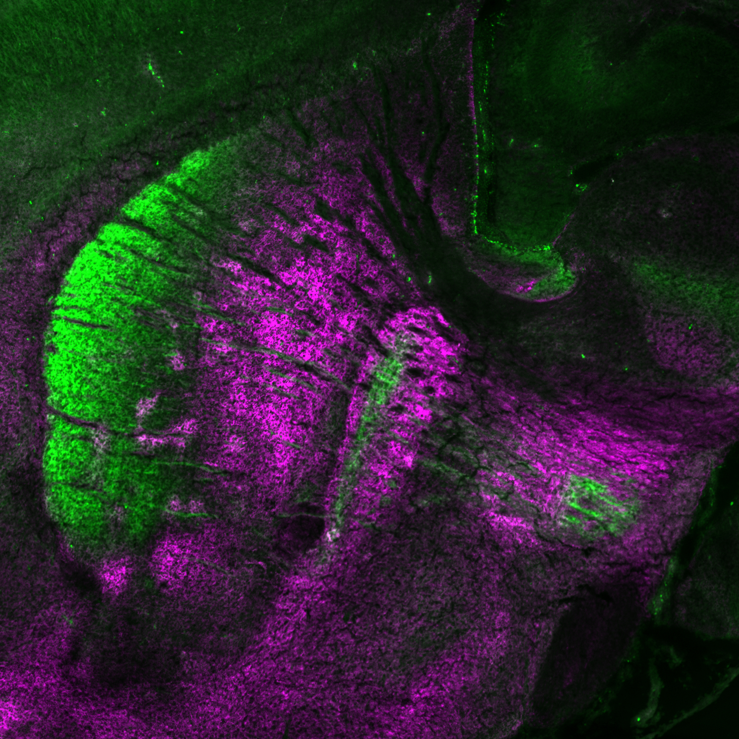 緑色に光る部分でPCDH17が発現しているのが分かる。