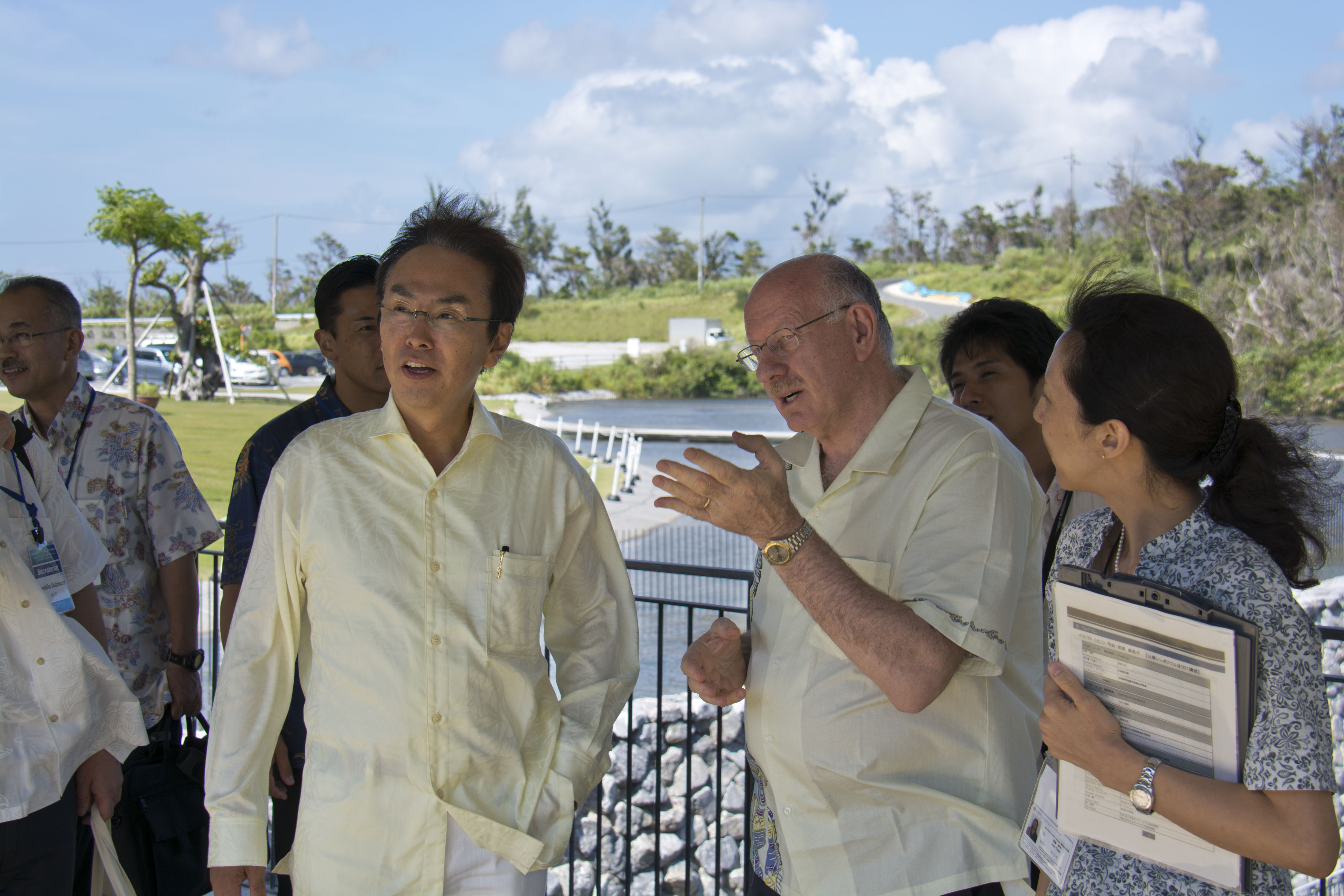 6月29、30日に「地球温暖化防止とサンゴ礁保全に関する国際会議」(主催:環境省、沖縄県、共催:OIST、琉球大学)がOISTキャンパスにて開催されました。石原伸晃環境大臣がキャンパスを視察し、太陽電池の新しい素材を開発するエネルギー材料と表面科学ユニット(ヤビン・チー准教授)やサンゴなどの海洋生物のゲノム研究を行うマリンゲノミックスユニット(佐藤矩行教授)の研究室を見学されました。