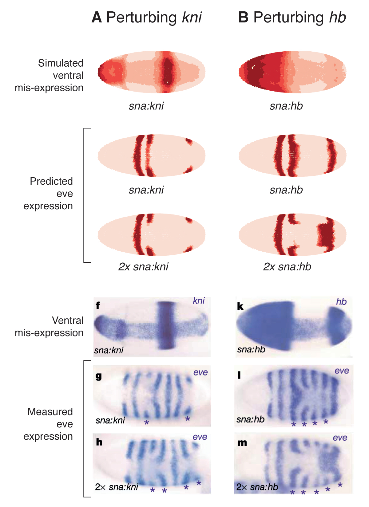 図は、モデルを用いた計算結果(上半分)と実際の胚の画像データ(下半分)の比較。kni遺伝子(A)とhb遺伝子(B)の異所性発現の結果、eve遺伝子の3および7番目の帯での発現は変化しており、この変化は計算結果と画像データで一致している。(A)kni遺伝子の異所性発現により3番目の帯が細くなり、さらにkni遺伝子量が2倍になると切れることが再現されている。(B)hb遺伝子の異所性発現では3番目の帯が膨らんで曲がり、さらにhb遺伝子量が2倍になると途中で切れている。7番目の帯はhb遺伝子量が2倍のときに膨らむ。2番目の帯はどちらの場合でも影響を受けない。