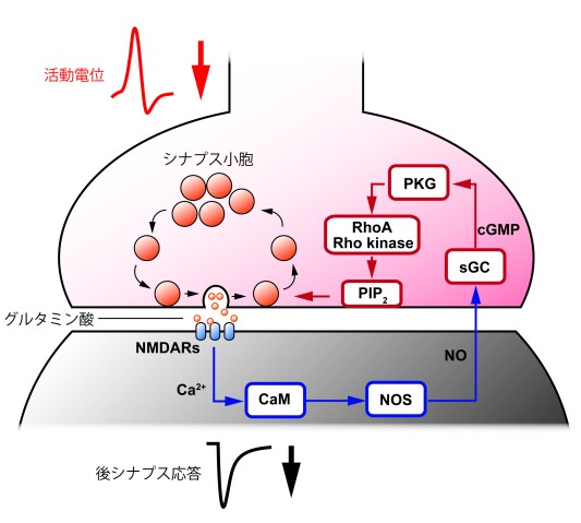 通常シナプスではシナプス前末端から後膜への一方通行の情報伝達が行われていますが、シナプス後膜から前末端への逆行性の情報伝達が起こることがあります。以前の研究では、この逆行性の情報伝達がシナプス前末端での小胞エンドサイトーシスを制御していることを報告しました。シナプス前末端から放出された神経伝達物質(グルタミン酸)は、シナプス後膜のNMDA受容体(NMDAR)に結合します。グルタミン酸を受け取ったNMDARは細胞内へとカルシウムイオンを流入させます。流入したカルシウムイオンはカルモジュリン(CaM)を、CaMはNO合成酵素(NOS)を活性化し、NOを生成します。NOは細胞膜を透過してシナプス前末端へと拡散し、前末端にある水溶性グアニル酸シクラーゼ(sGC)を活性化します。sGCが活性化するとサイクリックGMP(cGMP)を生成し、cGMP依存性プロテインキナーゼ(PKG)を活性化します。活性化したPKGはシナプス前末端内のPIP2濃度を上げ、小胞エンドサイトーシスを促進します。今回の研究では、このPKGとPIP2を単量体G蛋白質RhoAと、RhoAによって活性化するプロテインキナーゼ(Rhoキナーゼ)とが仲介していることを発見しました。