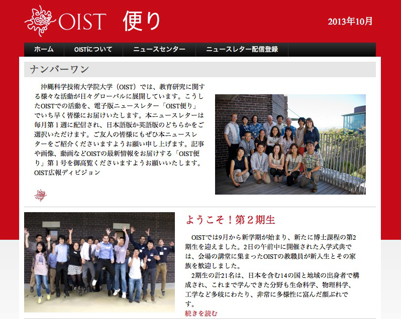 OIST便り 日付: 2013年10月2日 Copyright OIST (Okinawa Institute of Science and Technology Graduate University, 沖縄科学技術大学院大学). Creative Commons Attribution 4.0 International License (CC BY 4.0). 全解像度画像をダウンロード シェア: Related Images 砂糖粒上のOISTロゴの拡大画像 生物研究支援セクションの佐々木敏雄さんは、集束イオンビーム加工観察装置/走査型電子顕微鏡を使用して砂糖粒に一連のOISTロゴを刻み付け、それらを画像化しました。最大ロゴの幅は200マイクロメートルで、最小は12.5マイクロメートルです。 外での植物の観察 メリー・アン・プライス准教授が、沖縄に生えている植物について子供たちに説明 ジョナサン・ドーファン学長 第3期生に歓迎の辞を述べるドーファン学長 山口大臣をお迎えするドーファン学長 OISTのドーファン学長(写真中央)が内閣府特命担当大臣(沖縄及び北方対策、科学技術政策、宇宙政策)に就任された山口大臣(写真左)をお出迎えしました。 新たに提唱された2つの上門と3つの門 図1. 後口動物の系統的関係と脊索動物の進化。脊索動物の進化に関連した代表的な発生現象を示す。