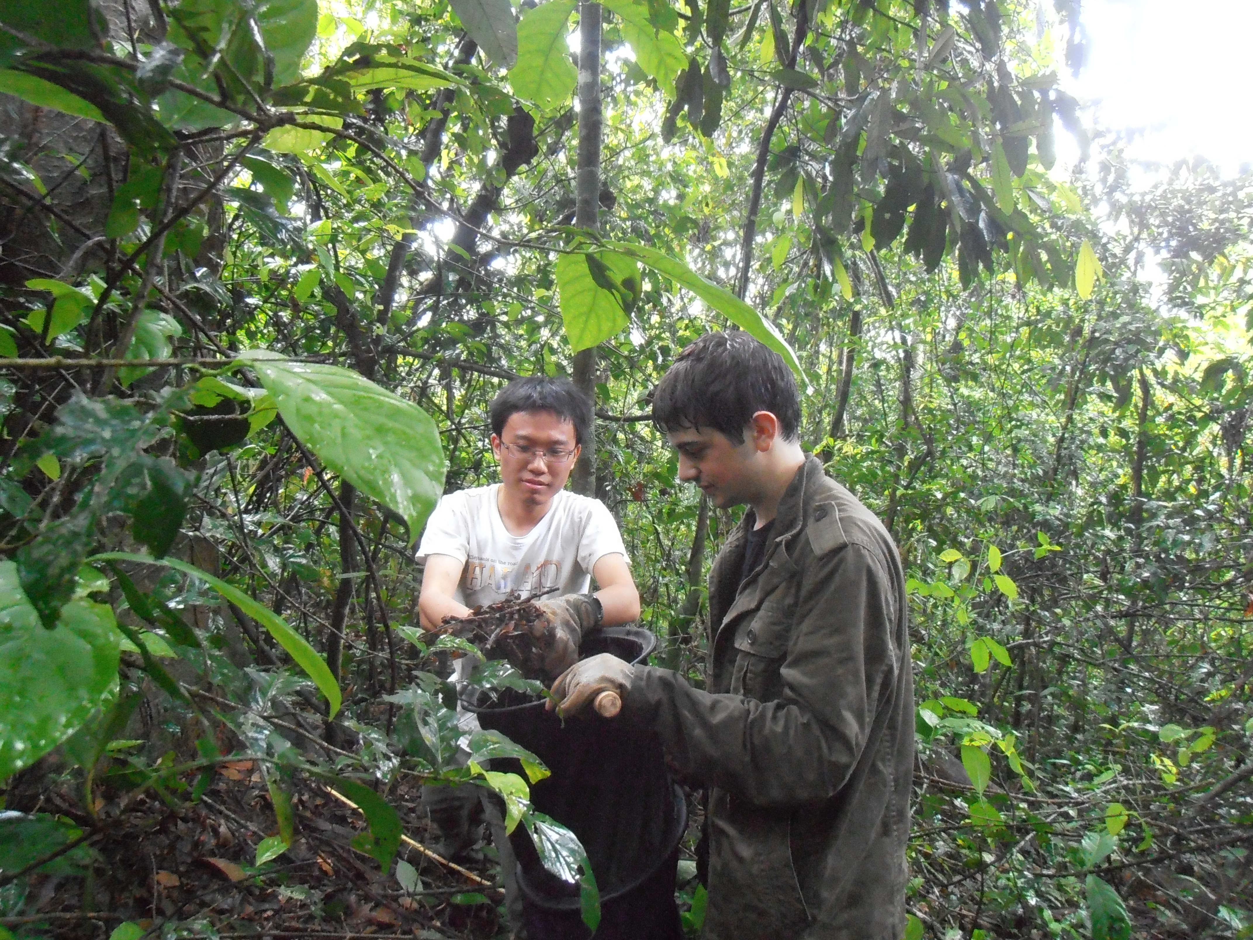 劉さん(左)とブランカードさん(右)が枯葉をふるう様子
