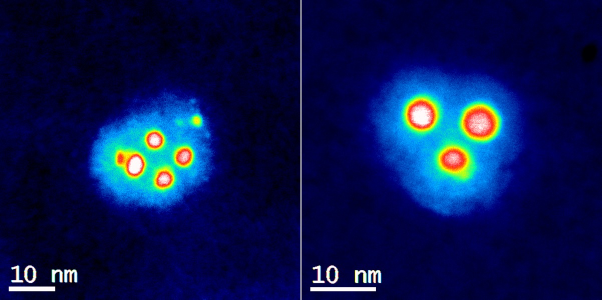生体適合性の外殻(シリコン製)に埋め込まれた複数成分(鉄および銀)の中心核を4個および3個有するハイブリッド・ナノ粒子