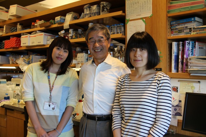 左から、菊口千智技術員、山本雅教授、李雪(リ シュエ)技術員。菊口技術員と李技術員は、マウスの交配や飼育方法、遺伝子発現の解析などで技術協力を行いました。