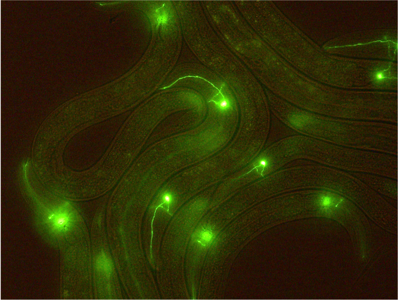 ASHニューロンに緑色蛍光タンパク質(GFP)マーカーを発現させたC. elegans