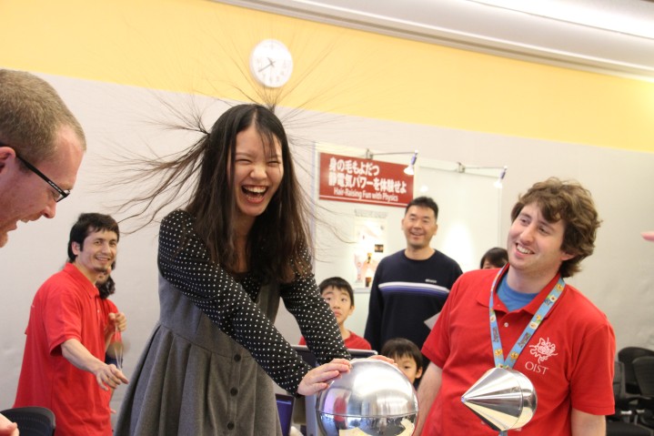 光・物質相互作用ユニットの体験ブース。大人から子供まで静電気を体感。大いに盛り上がりました。