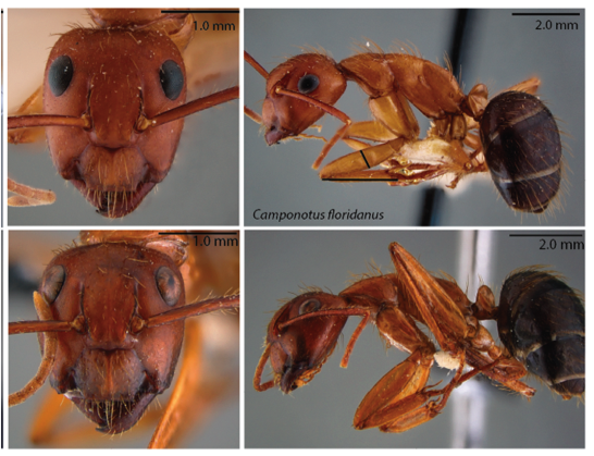 研究に使用された博物館の古いアリの標本のDNA抽出前後の比較。眼の変色は明らかであるが、DNA抽出後も標本はほとんど変化していない。