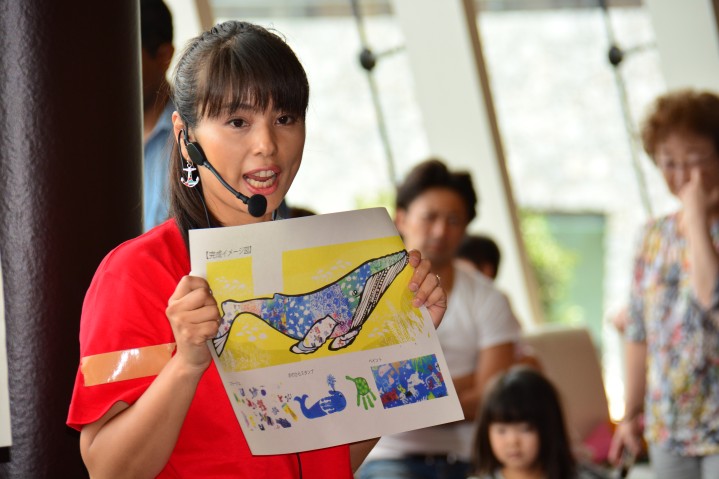 ザトウクジラの完成予想図を手にしたイラストレーターpokke104さん