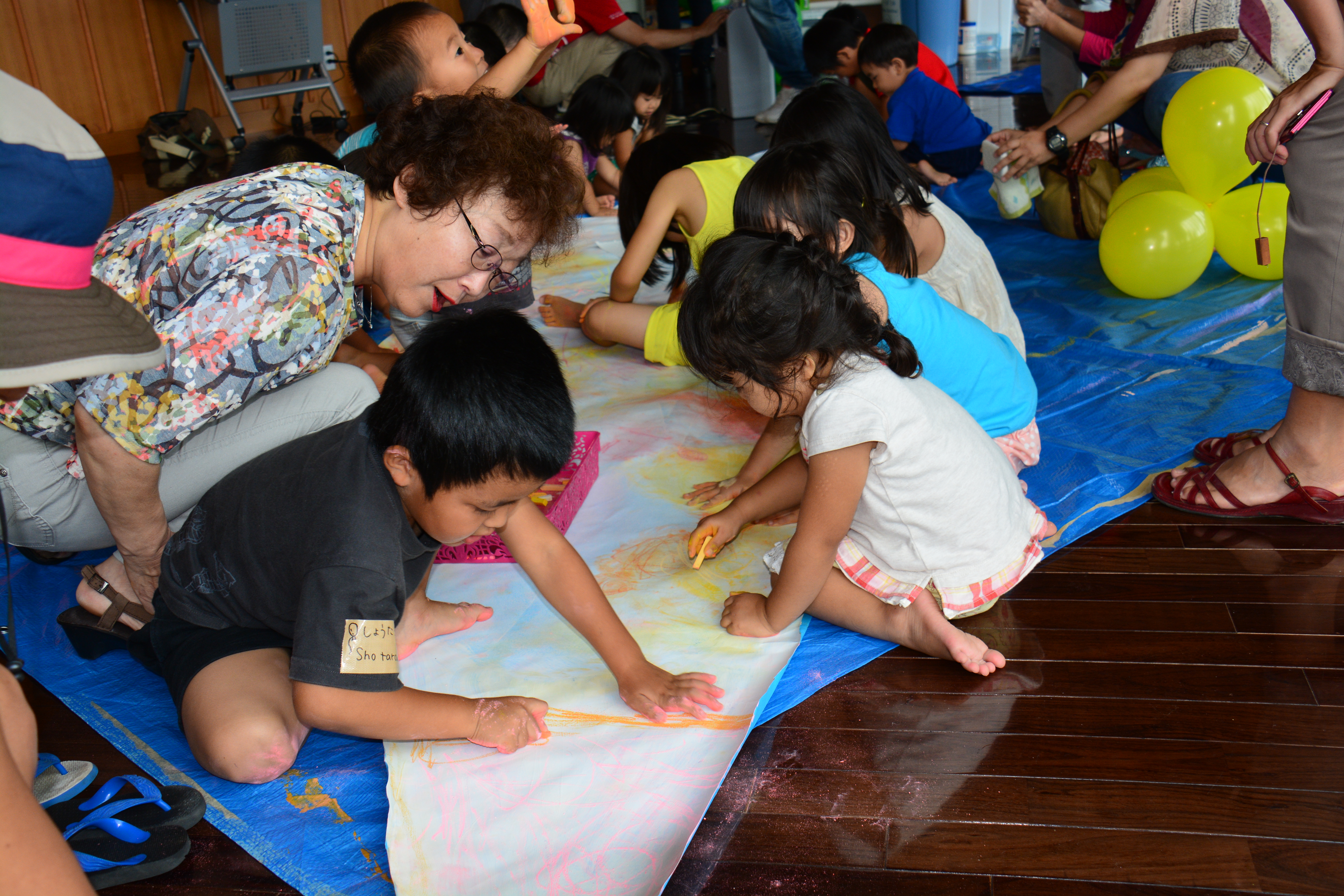 等身大のクジラの絵のパーツを描いていく地元恩納村から参加した子どもたちと保護者の方