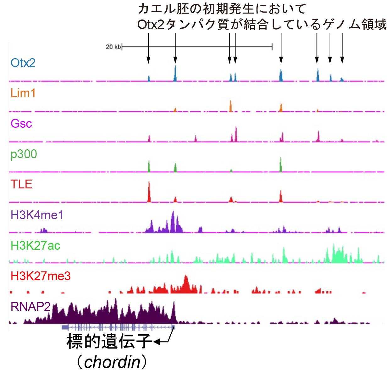 カエル初期胚から、特定のタンパク質が結合しているDNAを抽出し、次世代型シークエンサーで解析した結果の一例。この結果は、各種タンパク質が胚発生中のカエルのゲノムのどこに結合しているのかをグラフで示している。図の例は、初期発生において非常に重要な遺伝子の近傍に、多くのタンパク質結合領域が存在し、これらのタンパク質がその遺伝子の発現を調節していることを示唆している。