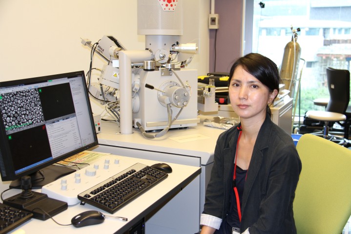 物理研究支援セクションの添盛亜紀子さんと電子顕微鏡設備。この設備を用い、日々OISTの物理学研究に貢献している。