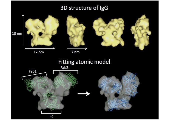 上記図は沖縄プロテイントモグラフィー株式会社(沖縄PT)が提供する画像解析技術によって得られた免疫グロブリンの立体像です。上段(黄色)で示しているのは、得られた像を縦軸を中心にして90度毎に回転させています。下段は、その像にX線結晶構造解析によって得られたリボンモデル(緑・青)を重ねた像です。タンパク質は非常に柔軟な構造を持っており、個々の分子の違いを解析することは生体内でのタンパク質の機能を理解する上で非常に重要です。沖縄PTの提供する技術では、一つ一つの分子を観察・解析することができる非常に有効な技術です。