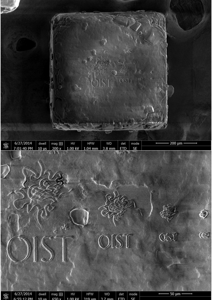 塩粒は砂糖粒より強い電荷を持っているので、塩粒上の最小ロゴ(写真上)は、砂糖粒上の最小ロゴ(写真下)ほど鮮明ではありません。佐々木さんは電荷を有しない金の薄い層で塩粒をコーティングしましたが、塩粒は強い電荷をもっているため、コーティングは困難を極めました。