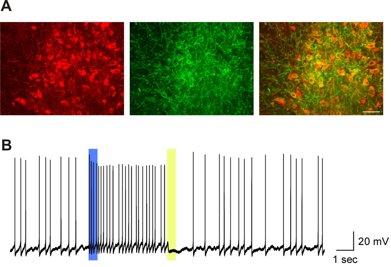 (A) 左図:セロトニン神経細胞(赤色)。中図:光に応答するたんぱく質(チャネルロドプシン2)を発現している神経細胞(緑色)。右図:左図と中図を重ねたもの。セロトニン神経細胞において選択的に光に応答するたんぱく質が発現している(橙色)。(B) 青色光刺激(500 ms、青線)で発火頻度を増大させるセロトニン神経細胞。この発火増大は数10秒間持続する。黄色光刺激(500 ms、黄線)で発火頻度は定常状態にもどる。