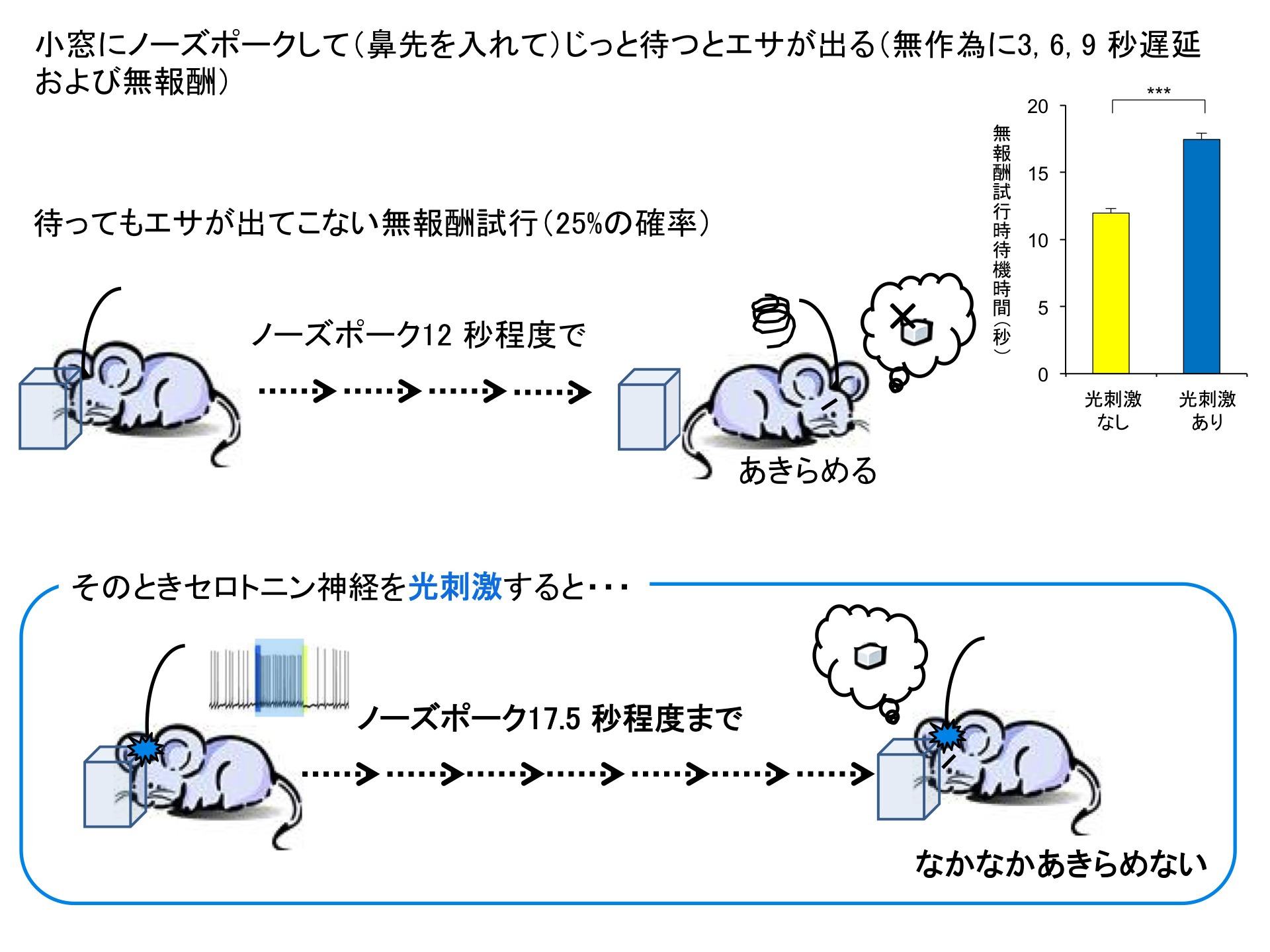 25%の確率でランダムにエサが出てこなくなる試行でマウスが自らあきらめてノーズポークを止めるまでの時間を測定した。通常は平均12秒間ノーズポークを続けてエサが出ないとあきらめるが、光刺激でセロトニン神経活動を増加させると、それが平均17.5秒間にまで延びた。
